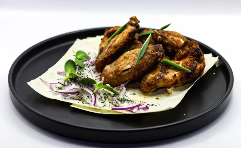 Ароматные куриные крылышки, маринованные в соевом соусе с копчёной паприкой, кориандром и чёрным перцем. Обжаренные на открытом огне до золотистой корочки, подаются с маринованным луком, свежим лавашом и зелёным луком.